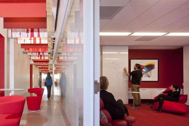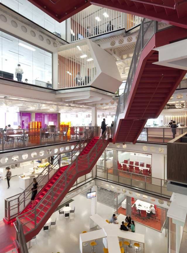 Дизайн офиса был придуман британской фирмой ARUP. Здесь есть красные ступеньки и стеклянные стены, которые и выделяют этот офис среди остальных обычных рабочих мест.