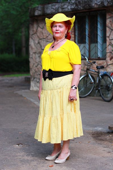 — Я люблю яркое и много вещей сочетаю зараз. Иногда закутаюсь, как капустный вилок, смотрю на себя и думаю: «Ну куда я так пойду?!» Наверное, эта манера от прадеда передалась, он был цыганом индийского происхождения. Там, в Индии, все так ярко одеваются. — Много всего происходит, за день всего не успеть. Развлечений мне вот так хватает, а счастья нет, потому что нет мужчины рядом со мной, а хотелось бы. Мужчины вокруг вроде есть, но от них одни насмешки, бабушкой они меня называют… какая я им бабушка?! Я женщина преклонных лет!!!— Однажды в автобусе мужчина на меня засмотрелся, такой сам невидный, а я еду, голову в сторону молодежного центра «Химик» повернула, на него не смотрю. И тут он мне говорит: «Я редко кому такие признания в общественном транспорте делаю, но у вас такое красивое лицо».