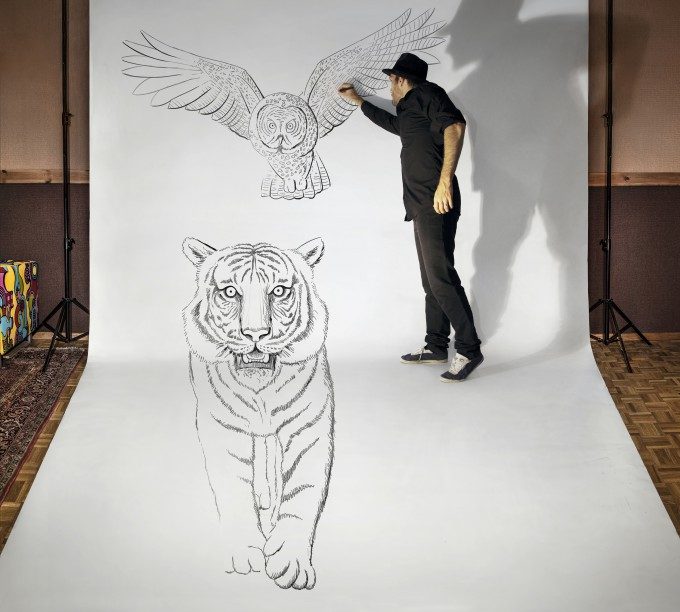 Забавные 3D-рисунки созданы на масштабном листе бумаги, прикрепленном к циклораме, конструкции, позволяющей создать плавный переход между горизонтальной и вертикальной плоскостями. Обманчивое впечатление трехмерности усиливается, когда мы видим самого художника, отталкивающего дуло пистолета, направленное на него, или удерживающего на привязи тигра.