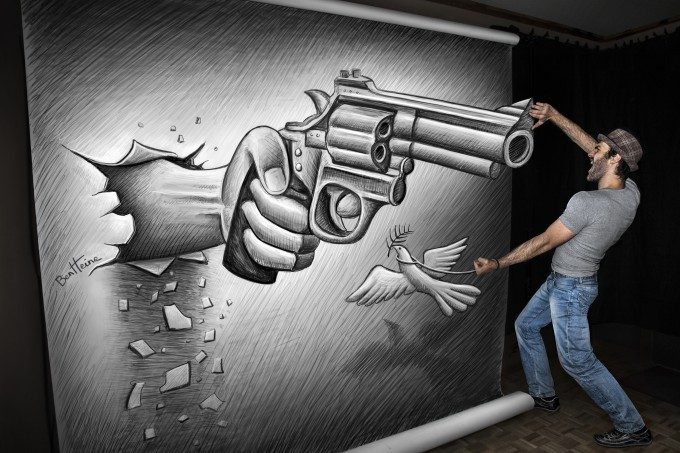 Для пущего эффекта Бен Хайне даже отрезал часть листа, чтобы дуло револьвера выглядело более реалистично. Судя по всему, эта художественная находка может стать излюбленным приемом, который художник будет использовать в своих последующих работах, чтобы вновь и вновь удивлять нас, зрителей.