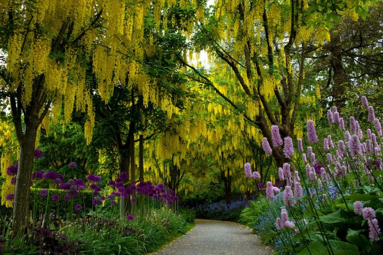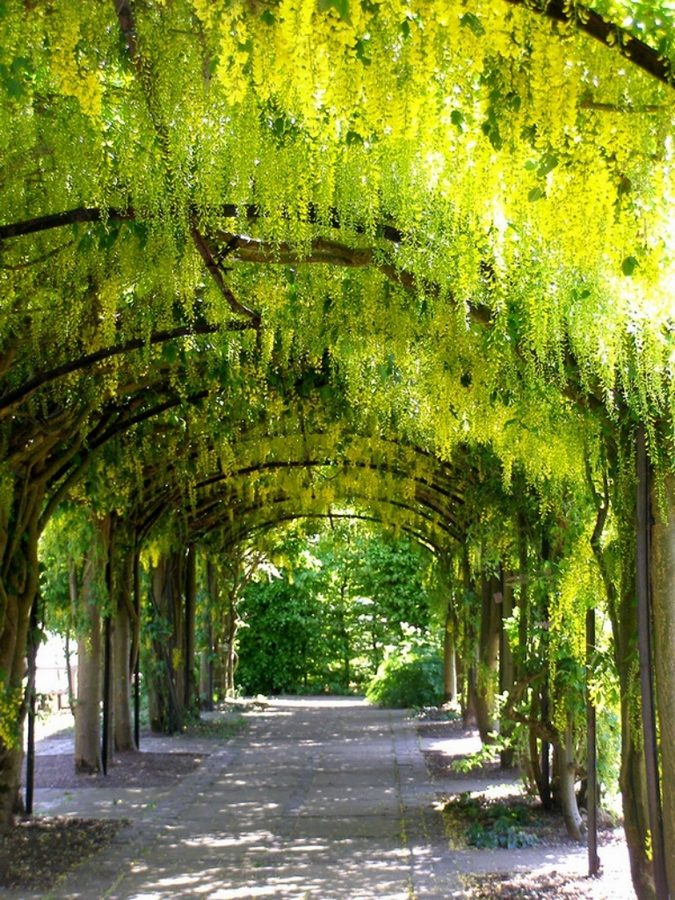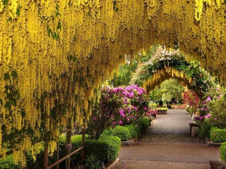 Лабурнум — растения семейства Бобовые. Когда деревья сажают напротив друг друга и направляют по дуге, образуется великолепный желтый купол над головой. Представляю вашему вниманию творения человека и природы.
