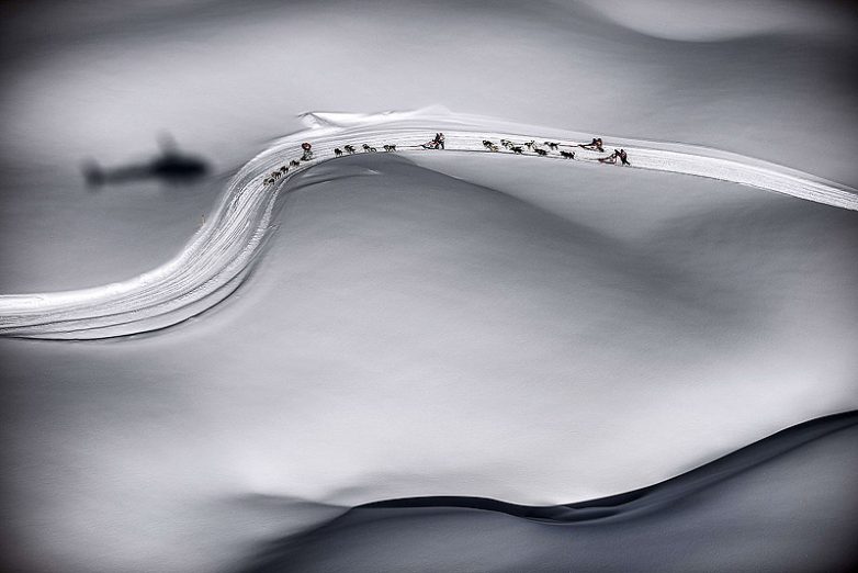 18 января 2013 года. Гонка на собачьих упряжках, вид сверху, Межев, Франция. (Jeff Pachoud–Agence France-Press/Getty Images)