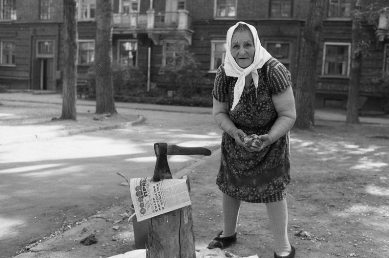 Ужас. Не могу понять там бабка, рядом топор. Она что несет в руках? щенка?.. Но все страшно вспомнить. и бесконечные очереди