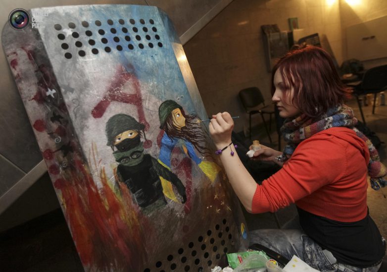 Художница рисует на щите евромайдановца в Киеве, Украина. (Konstantin Chernichkin/REUTERS)