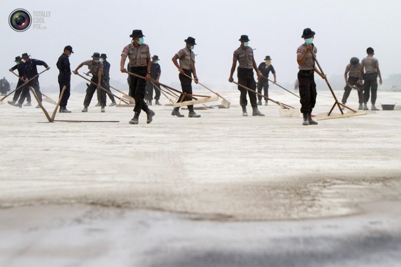 Полицейские убирают пепел вулкана Келуд в аэропорту в Джокьякарте, Индонезия. (DWI OBLO/REUTERS)