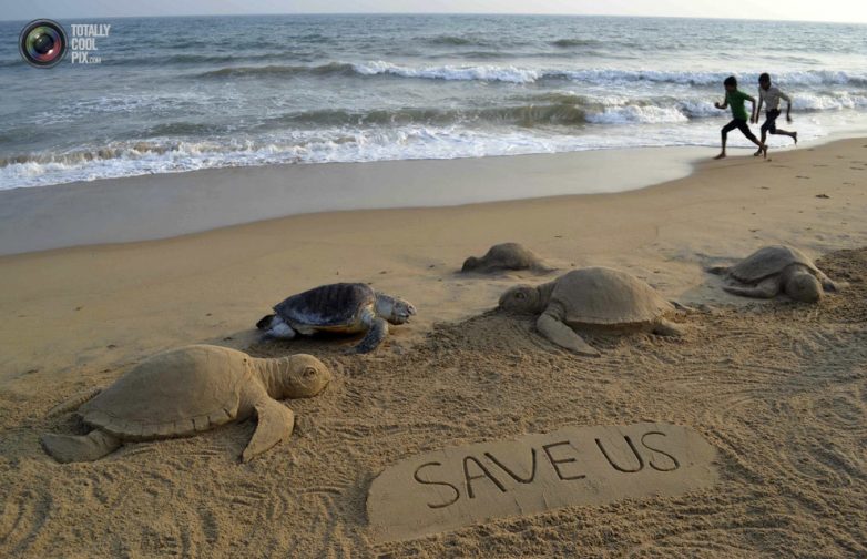 Мёртвая черепаха лежит рядом с песочными скульптурами индийца Паттнаика (Pattnaik) в городе Пури, Индия. (STRINGER/INDIA/REUTERS)