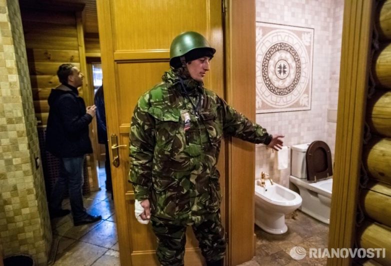 22 февраля у ворот загородной резиденции президента Украины собрались люди, которые своими глазами хотели посмотреть на «золотые унитазы Януковича». Охрана покинула объект, и люди стали небольшими группами заходить внутрь загородной виллы.