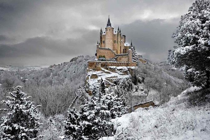 В исторической части испанского города Сеговия можно увидеть крепость Алькасар. Она возвышается на скале в месте слияния двух рек Эресма и Кламорес. В разное время крепость служила для разных целей. Она была и королевской резиденцией, и тюрьмой, и артиллерийской академией. Этот замок читается одним из самых красивых старинных строений в Испании.