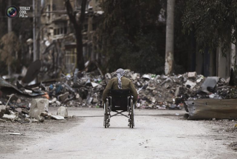 Мужчина едет по разрушенной улице города Дейр-эз-Зор, Сирия.