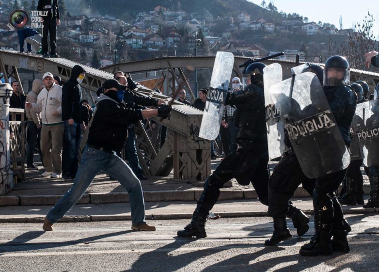Столкновения между полицией и антиправительственными демонстрантами в Сараево.