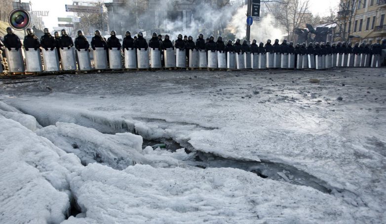 «Беркут» стоит недалеко от баррикад демонстрантов в Киеве.