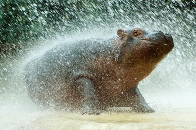 Двухмесячный детеныш гиппопотама принимает душ под шлангом в зоопарке Берлина.