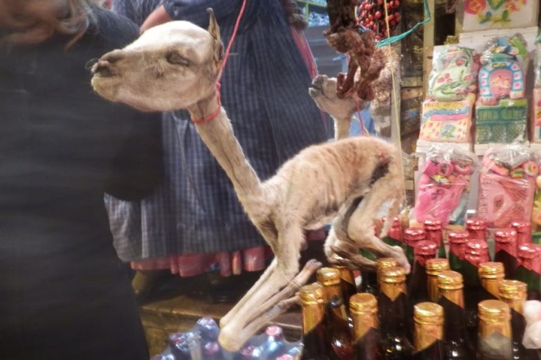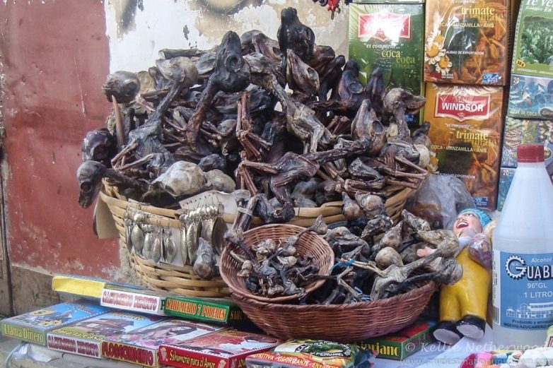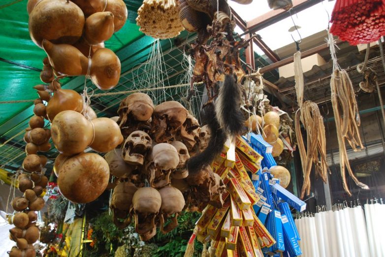 Один из крупнейших рынков для колдунов находится в фактической столице Боливии – городе Ла-Пас, на 3600 метров возвышающимся над уровнем моря. В основном сюда приходит местные колдуны и хилеры, которых здесь называют каллаваями, однако встречаются и простые туристы, бродящие от прилавка к прилавку в поисках зелья любви, амулета удачи, ладана и свеч от злых духов. Особого внимания заслуживают мумифицированные останки животных или разделанные тушки зверьков, вроде высушенных жаб или летучих мышей, и, конечно же, зародышей лам – их продают от $2 за штуку. Здесь же, кстати, можно приобрести свежие листья коки, без которых местные оккультисты буквально жить не могут.