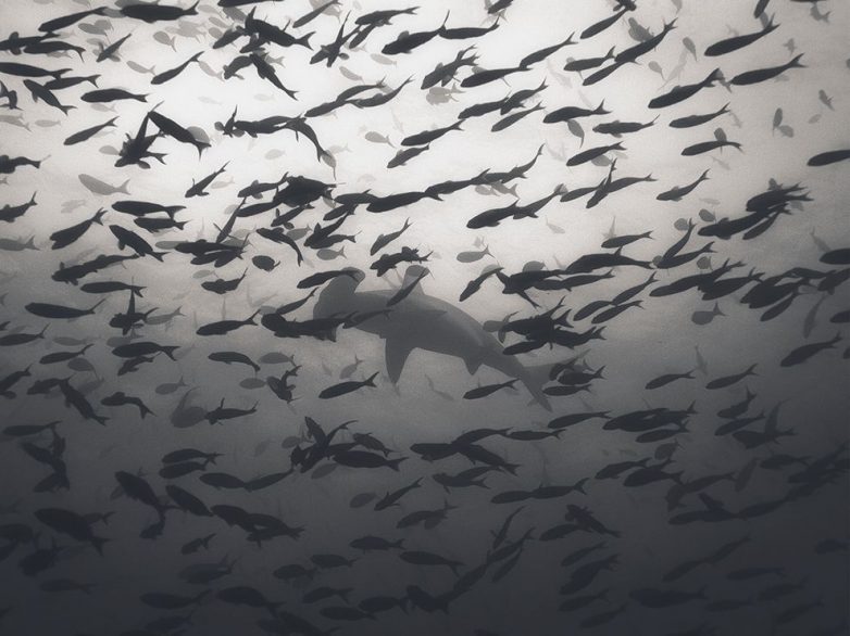 Облако мелкой рыбы и акула-молот. Также смотрите «Акулы — грозные хищники морей и океанов». (Фото Denis Nezhentsev):