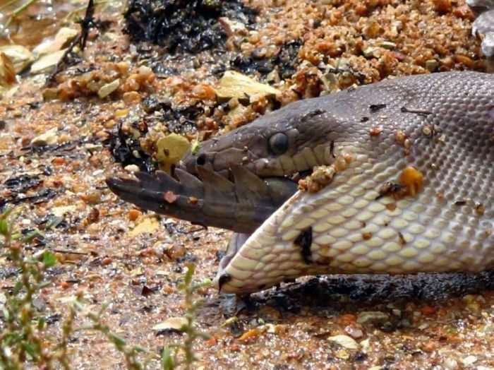 крорко, просто… и не сдался… Змеи, захватив добычу, сперва её душат своей массой, и- шею… Добычу вынуждая слабеть, умирать… обездвиживают её сперва. Кроко не-мог полностью его заглотить… плюс- у-змей, некоторых, есть яд, которым, они обездвиживают свою жертву… Всё ясно?