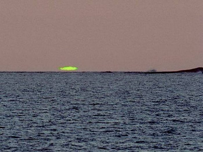 Редчайшее оптическое явление, возникающее на восходе или закате Солнца. Выглядит, как вспышка зелёного света на горизонте (как правило, морском).