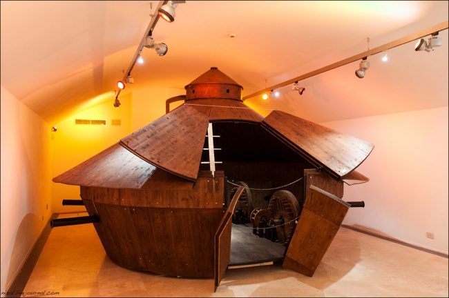 Такой вот тазик на колесах с пушками и башенкой и есть прародитель современных танков. Он был оснащен системой зубчатых колес, которые составляли последовательность. Восемь человек были защищены от сражения внешней оболочкой, поэтому могли доставить пешим ходом такого «ежа» прямо в гущу сражения, не будучи ранеными.