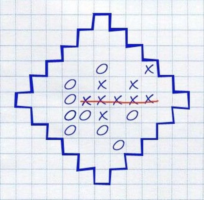 Игра для двух человек — для тебя и соседа по парте. Задача — окружить точками своего цвета точки противника. Соперники по очереди ставят точки на пересечении линий листа в клетку, каждый своим цветом. При создании непрерывной (по вертикали, горизонтали, диагонали) замкнутой линии образуется область. Если внутри неё есть точки противника (при этом могут быть пункты, не занятые чьими-либо точками), то это считается областью окружения, в которую далее запрещено ставить точку любому из игроков. Если точек соперника нет, то область свободная и в неё можно ставить точки.