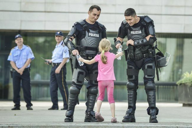 Румынский ребенок вручает воздушный шарик работнику полиции во время протестов в Бухаресте.