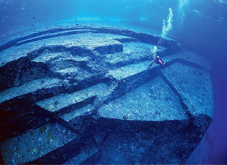 Монументы из огромных каменных платформ и столбов, расположенных под водой на глубине от 5 до 40 метров, были обнаружены в 1986 году. Главное из этих сооружений имеет вид пирамиды. Недалеко от него находится крупная площадка со ступенями, похожая на стадион со зрительскими трибунами. Один из объектов напоминает огромную голову, как у статуй моаи на острове Пасхи. В научном сообществе ведутся споры: многие считают, что лежащие на дне океана образования имеют исключительно природное происхождение. Но одиночки вроде Масааки Кимуры, профессора университета Рюкю, неоднократно нырявшего к развалинам, настаивают, что тут не обошлось без человека.