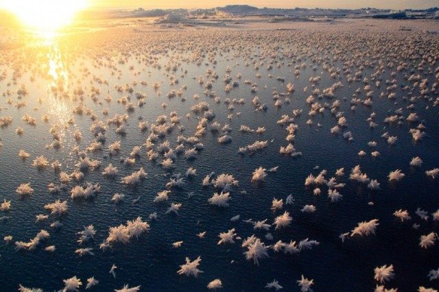 29. Замороженные цветы. На спокойных водах озер и морей, когда поверхность только-только схватывается легкой коркой льда, в условиях резких похолоданий (около – 22 С) возникают кристаллы свежего льда дивной формы.