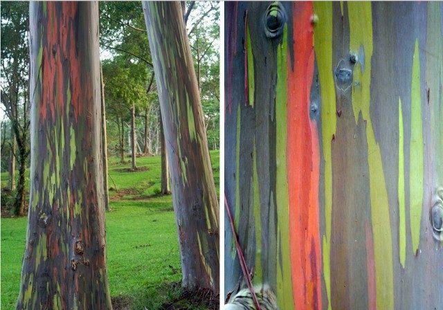 28. Радужные эвкалипты. Сброшенная в разное время поверхностная эвкалиптовая кора обнажает свежие участки ствола дерева. По-разному созревая и темнея, эти участки обнаруживают совершенно отличные друг от друга яркие оттенки. Каждый кусочек ствола последовательно приобретает синий, фиолетовый, оранжевый, а затем – темно-бордовый цвет.