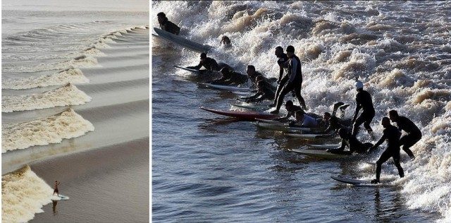 16. Приливные валы. В Бразилии, на Амазонке и в Англии, на Северне к берегу порой приходят особые виды волн. Передний край прилива в таком случае формирует противостоящие потоки, перемещающиеся навстречу течению поверх основного водного массива.