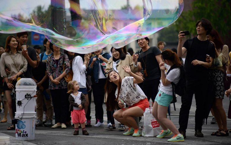 3. Туристы смотрят с удивлением на гигантский пузырь на улице в Сеуле, Южная Корея, в понедельник. (Фото: Эд Джонс / AFP)
