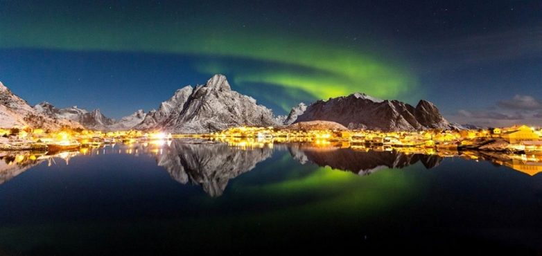 4. Северное сияние мерцает над рыбацкой деревней Рейне на норвежских Лофотенских островах. «Отраженная Аврора» Алекса Кону заняла второе место в номинации «Против огней».