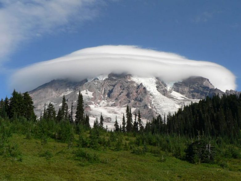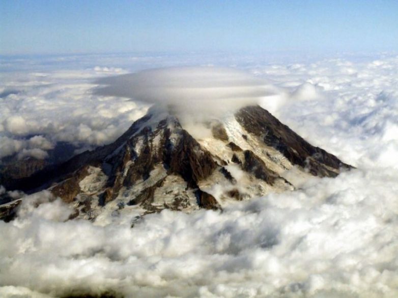 Линзообразное облако над могучим вулканом Маунт-Рейнир.