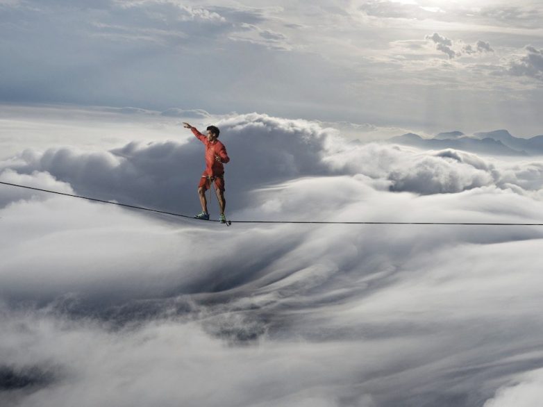 Стремительный шторм поглощает скалу Педра-да-Гавеа, и кажется, будто Кайо Афето идет по облакам. Профессиональный канатоходец оказался между двумя горами, возвышающимися над Рио-де-Жанейро, когда налетевший бриз окутал 850-метровую вершину туманом. (Фото Кита Ладзински):