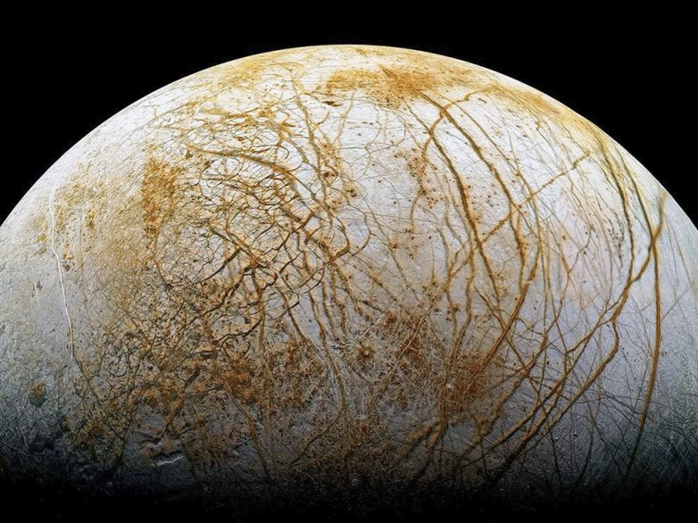 Под иссеченным трещинами ледяным покровом Европы, который мы видим на этом изображении, полученном с помощью космического аппарата Galileo, скрывается океан, где могут быть все условия, необходимые для жизни. (Фото Galileo/NASA/JP):