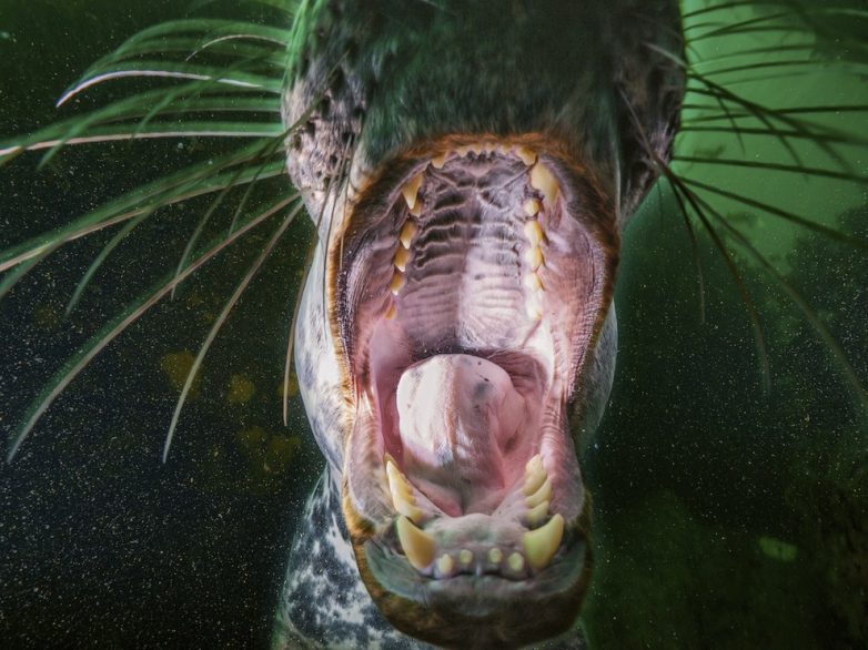 Любопытный серый тюлень близ полуострова Гаспе с открытым ртом дивится на фотографа Дженнифер Хэйз. Коммерческие рыбаки и некоторые ученые считают, что именно голодные тюлени мешают восстановлению популяции трески. (Фото Дженнифера Хэйза):