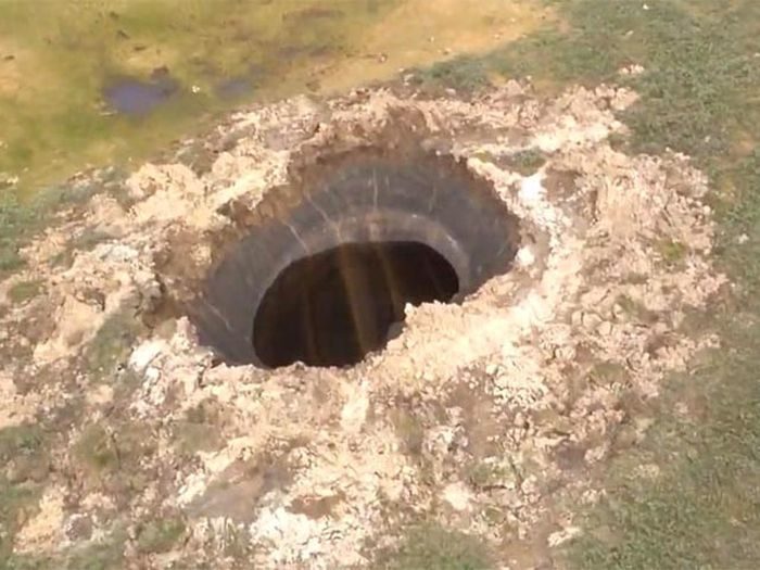 На Ямале обнаружен гигантский провал грунта. Вертолетчики, обслуживающие нефтяные и газовые промыслы и заснявшие воронку с воздуха, сообщают, что ее размер столь велик, что внутрь можно спокойно спускаться на нескольких вертолетах Ми-8.