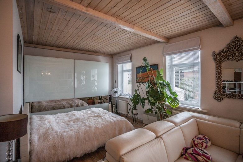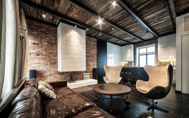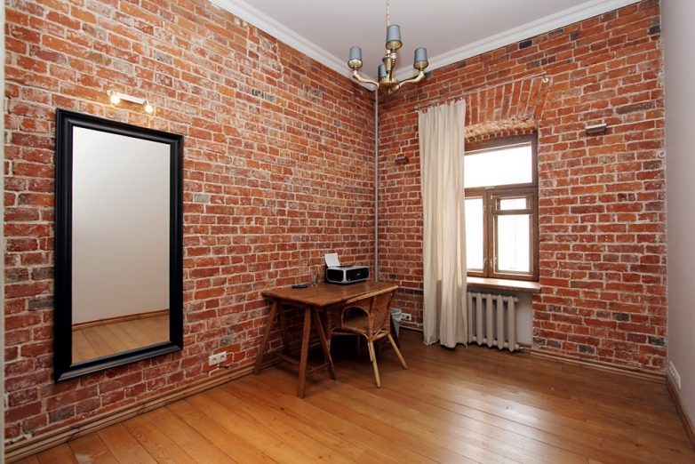 Старинные и отреставрированные распашные двери ведут в кабинет из светлой и просторной гостиной на 3 окна. Из зоны столовой через такие же распашные двери открывается вход в спальню, решенную в стиле “лофт”. Использована старинная кирпичная кладка и открытая проводка, кухонная мебель в индустриальном стиле и красивые итальянские светильники.
