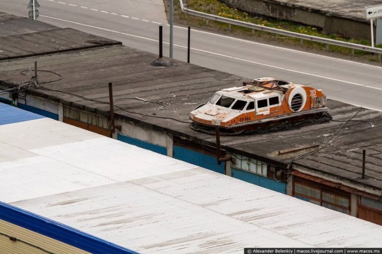 Заброшенный вездеход на крыше гаражей.