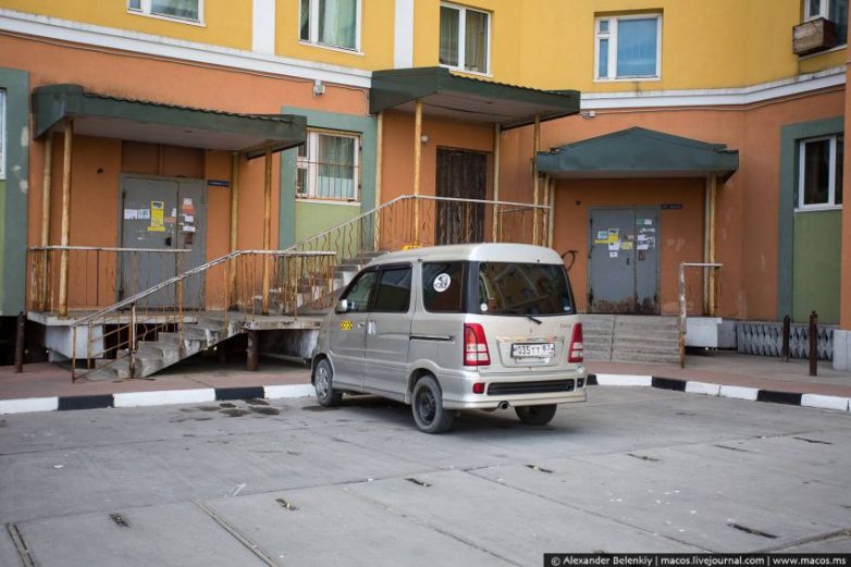 Ну, и примерно половина этих самых японских машин это такси. Присмотритесь к подъездам. Их двери очень часто загажены объявлениями и рекламой, за этим никто не следит. А может быть, сказывается отсутствие в городе таджиков и пофигизм жителей. Красивые издалека цветные дома вблизи частенько расстраивают.