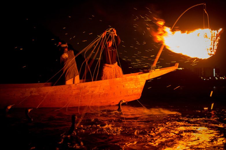 3. Бакланная рыбалка начинается поздно вечером. Единственным освещением для нее служат небольшие сосновые факела на борту. Лодки медленно плывут по реке, а птицы ожидают команды дрессировщика, после которой стремительно и синхронно погружаются в воду и заглатывают мелкую форель. (Фото Chris McGrath | Getty Images):