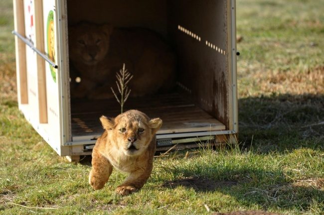 Полугодовалого львенка выпускают на свободу в Южной Африке.