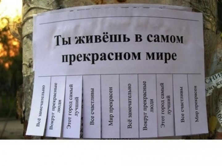 Среди нас люди, готовые поделиться крупицей добра с каждым, развесив объявления на столбах о том, что, например, стоит вспомнить все хорошее и забыть плохое. Не бояться неудач, любить своих близких и, наконец, просто улыбнуться.