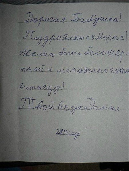 Прикольно, особенно смешно пожелание бабушке мгновенно готовить еду)))Спасибо!