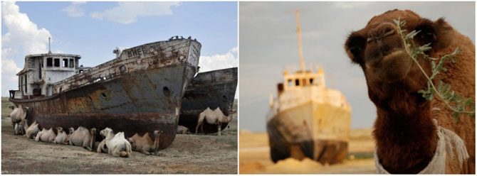 Почему эти корабли в пустыне? А потому, что раньше здесь был четвёртый по величине в мире водоём. Всё, что сейчас от него осталось — это три небольших озера, разделённых пустыней. И верблюды. Много верблюдов.