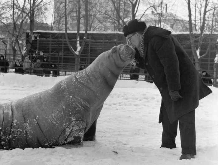 Зоотехник Геннадий Немов с моржом Бароном в столичном зоопарке. Московский зоопарк, 1968 год
