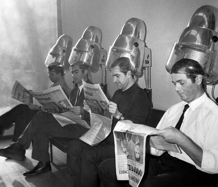 Посетители парикмахерской читают новости о полете космических кораблей «Союз-4» и «Союз-5» Москва, 1969 год