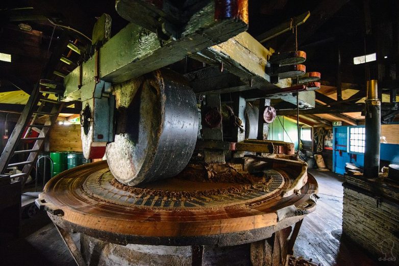 14. Основная часть — огромные жернова, весящие около 5 тонн, вращающиеся по кругу и плющащие маслосодержащие семена или орехи. Т.к. настил под ними истирается очень быстро, стали использовать пластину из чугуна. Когда семена или орехи окончательно перетерты, их нагревают и перекладывают в мешки. Мешки крепятся и по ним начинает ударять копер (справа), выдавливая масло. Из-за громких ударов у работников мельницы возникают проблемы со слухом.