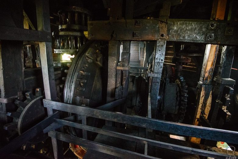 15. Поднимаюсь выше. Огромные деревянные шестерни вращатся, передавая момент от крыльев к исполнительным механизмам. Они являются прообразом механической коробки передач: с помощью подключения различных колес можно управлять подаваемым моментом или переключать его на исполнительные механизмы: