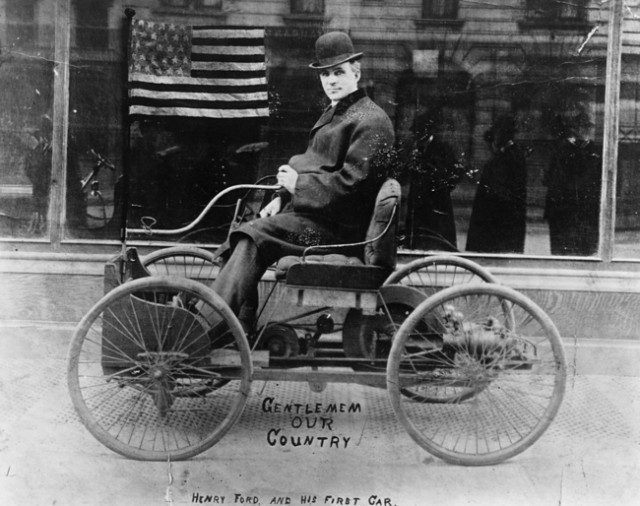 9. Генри Форд позирует в созданном им первом автомобиле «Форд-Квадроцикл» (1896 год). Первая модель, отличающаяся невиданной устойчивостью и мощью, которую обеспечивал двигатель внутреннего сгорания, произвела фурор среди знатоков техники и просто заинтересованных зрителей.