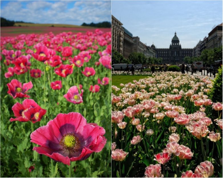 Цветы Чехии — розовые маки и тюльпаны.