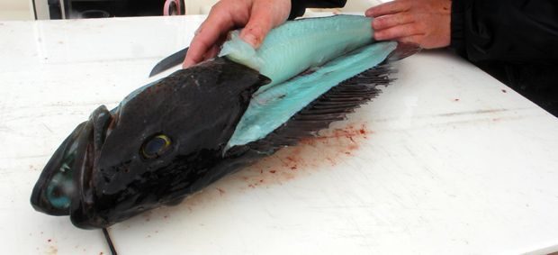 Вот так выглядит мясо примерно каждого пятого зубастого терпуга (Lingcod), обитающего на западном побережье Северной Америки. Есть мнение, что сине–зелёный цвет мясу придаёт биливердин, зелёный пигмент желчи. Но почему это происходит (и почему только у некоторых терпугов) — не ясно. А при термической обработке цвет исчезает