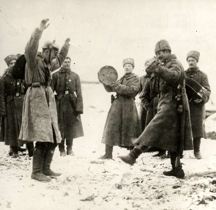 Русские солдаты учат немецкого пленного русским народным танцам, 1915 г